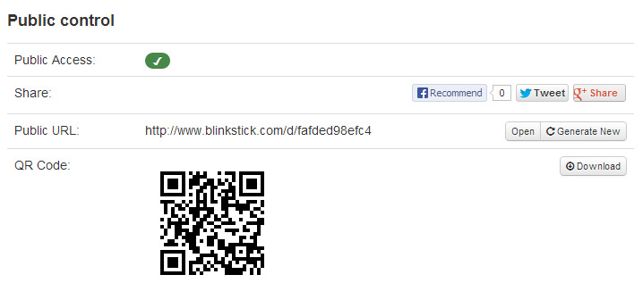 Enable public access for your BlinkStick and you will see "Public" section in the device details page. Your LED will have a public page and you can share it to Twitter, Facebook and Google Plus using the button or just posting the public URL anywhere on the Internet. The QR code contains the URL encoded for devices which have barcode scanner application.